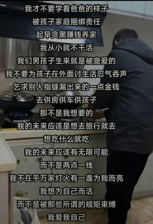 传统观念里面女性觉得男的应该赚钱养家,嫁汉嫁汉穿衣吃饭。但新一代男性觉得,大家都是独立的个体凭什么我要付出更多。