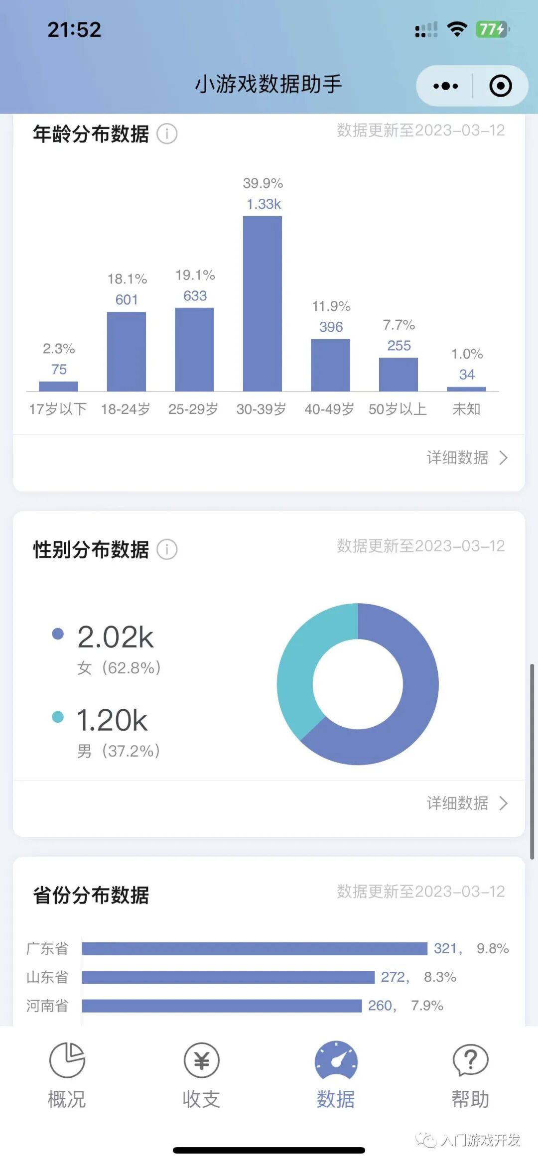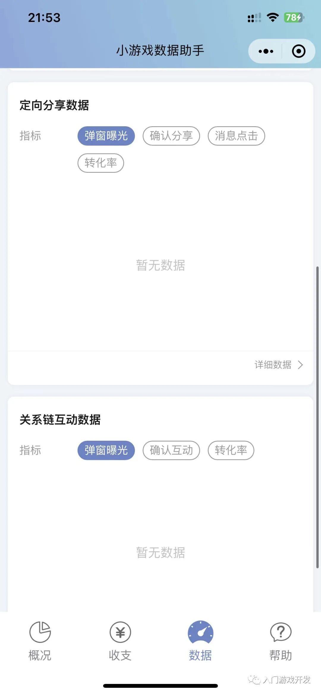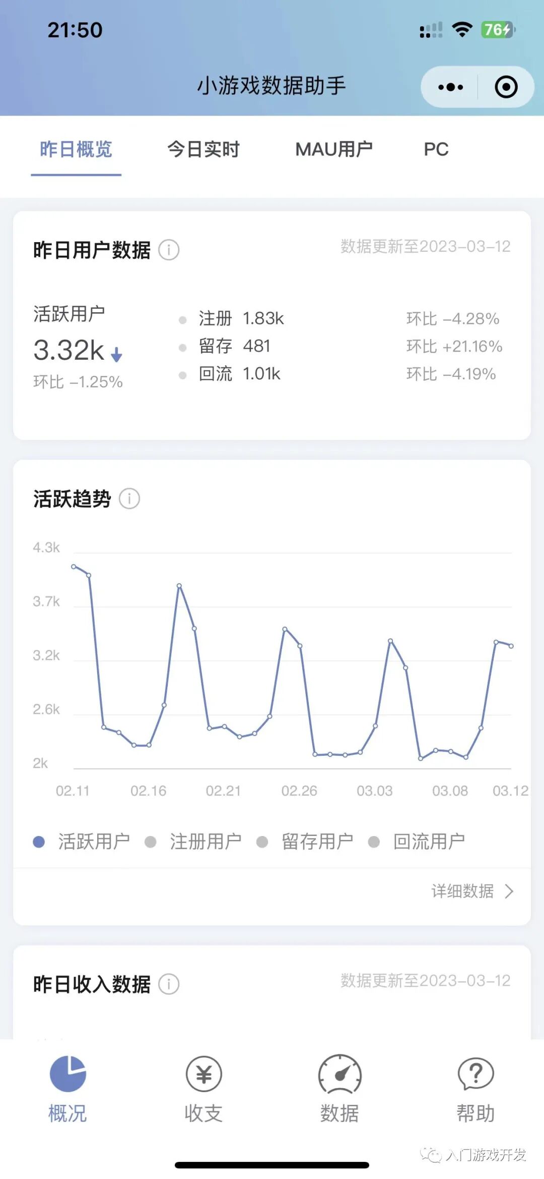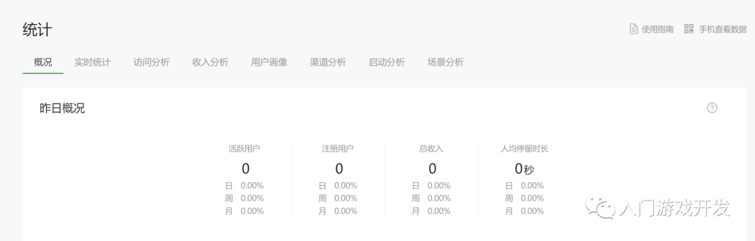 MP(mp.weixin.qq.com)平台:可以查看小游戏的用户数据、用户留存、活跃度、付费情况、流量来源等。
