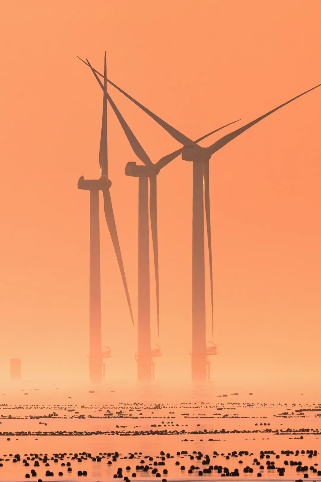 (上文数据以山东莱州海上风电场的8MW风机为例,其满发状态下,转一圈的发电量为16千瓦时。下图为迎风而立的“巨人军团”,摄影师@NoOne晓东)