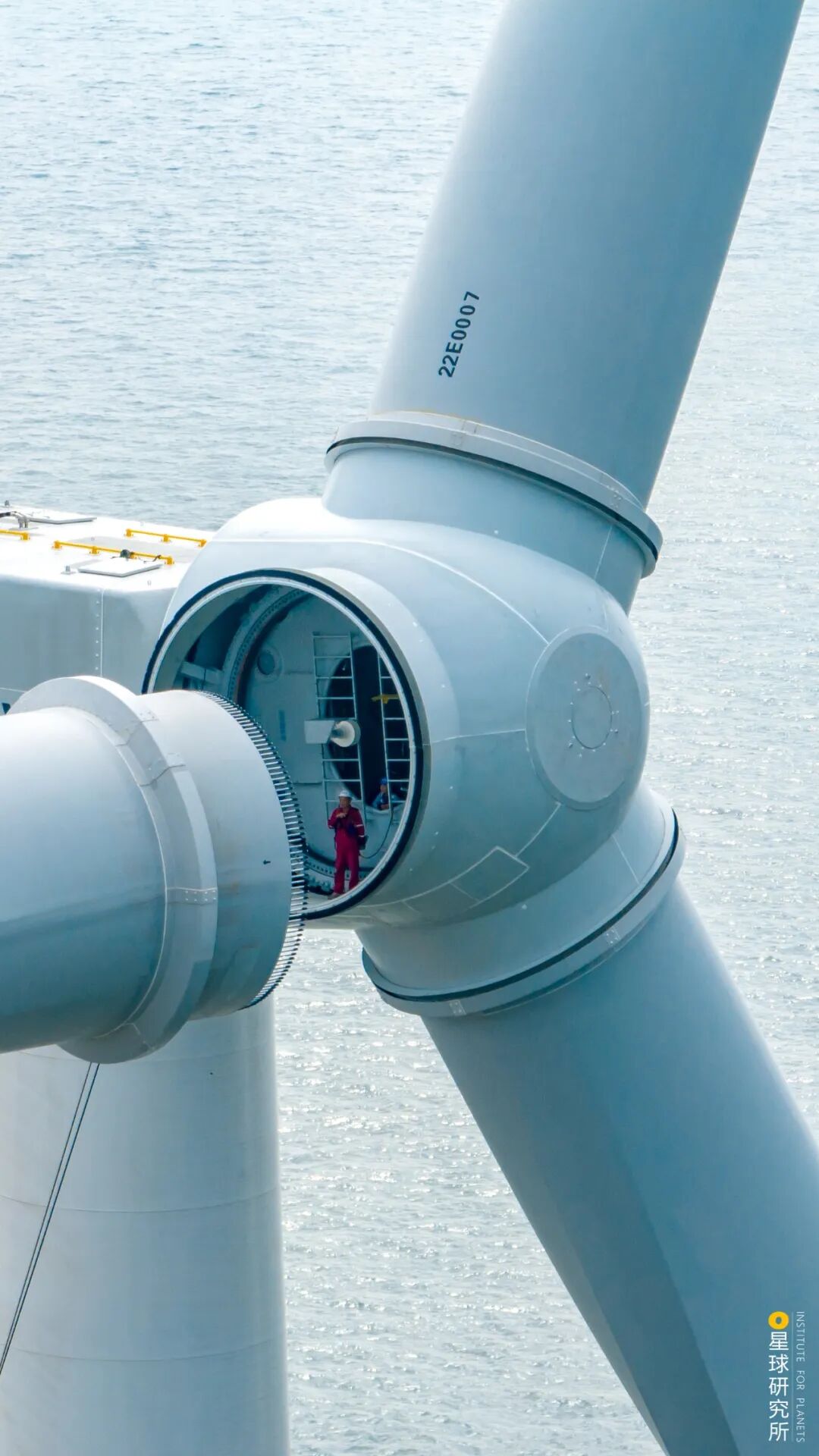 (截至2021年底,中国海上风电累计装机2639万千瓦,占到全球海上风电总量的48%。下图为正在吊装的风机叶片,注意轮毂与工作人员的对比,摄影师@李雪松)