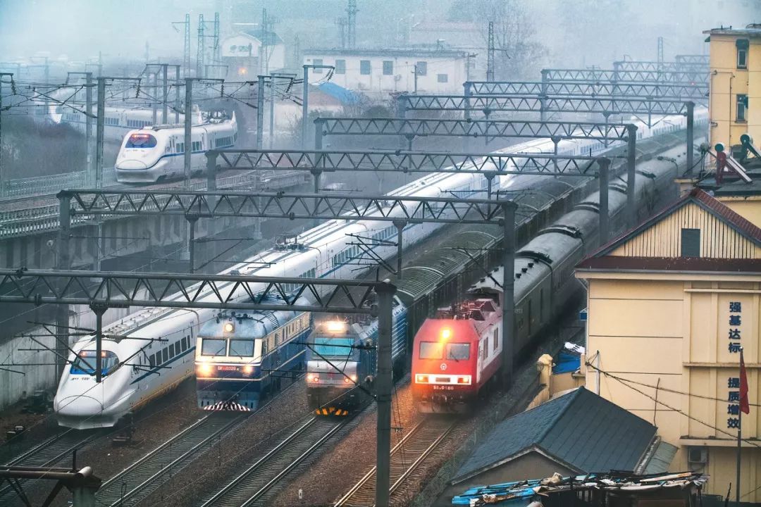 ▼上文数据来自《2017年铁路统计公报》;下图为4种不同的列车同时行进在南京站前,摄影师@房星州