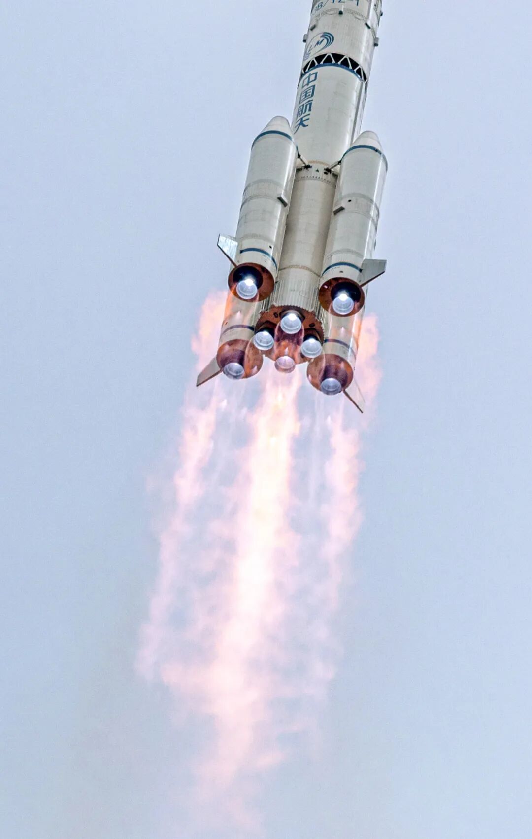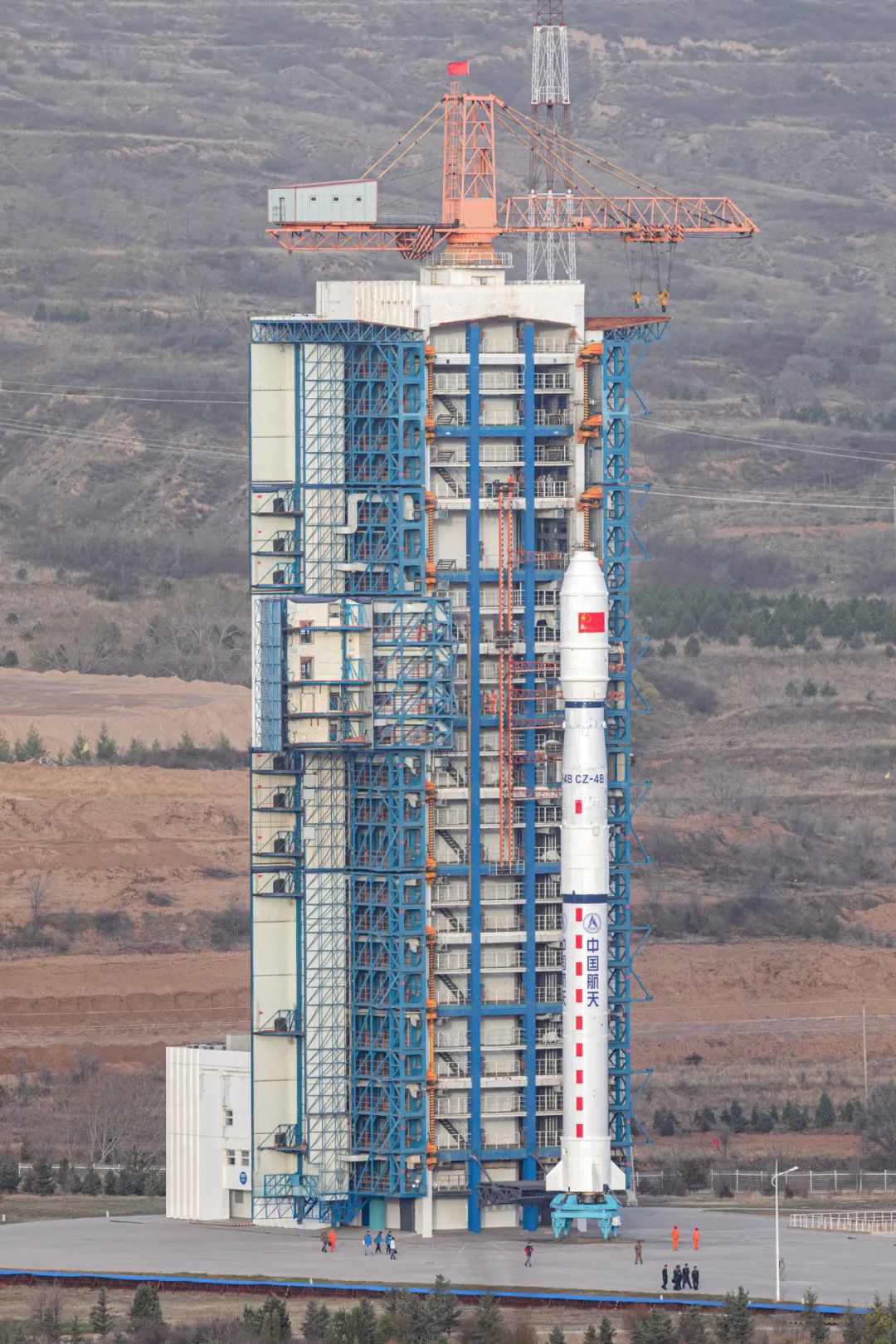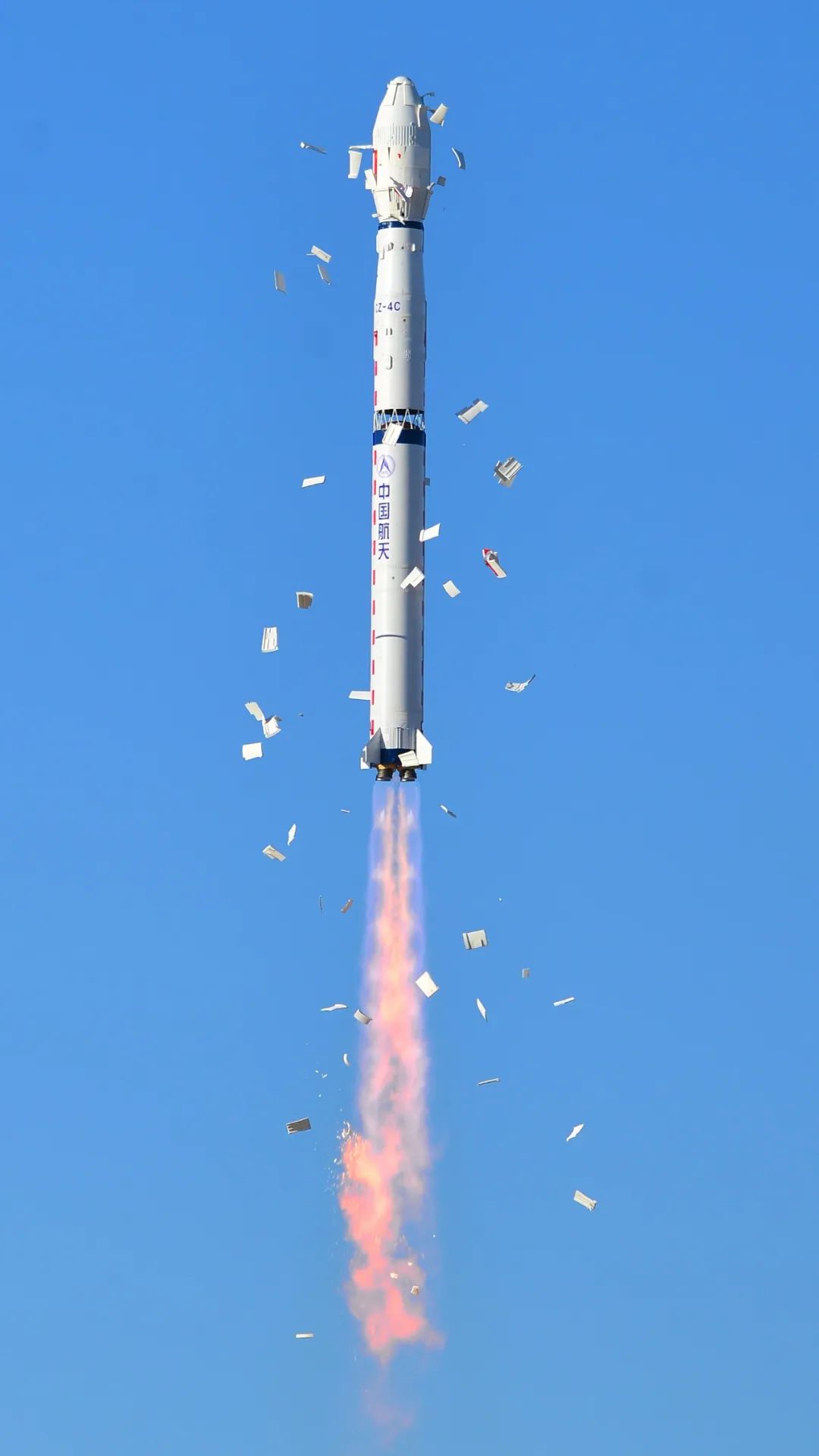 (两级间的“镂空”结构即为斜拉金属杆;下图为长征四号丙的外形,供示意,剥落的是泡沫保温层,摄影师@韩超)