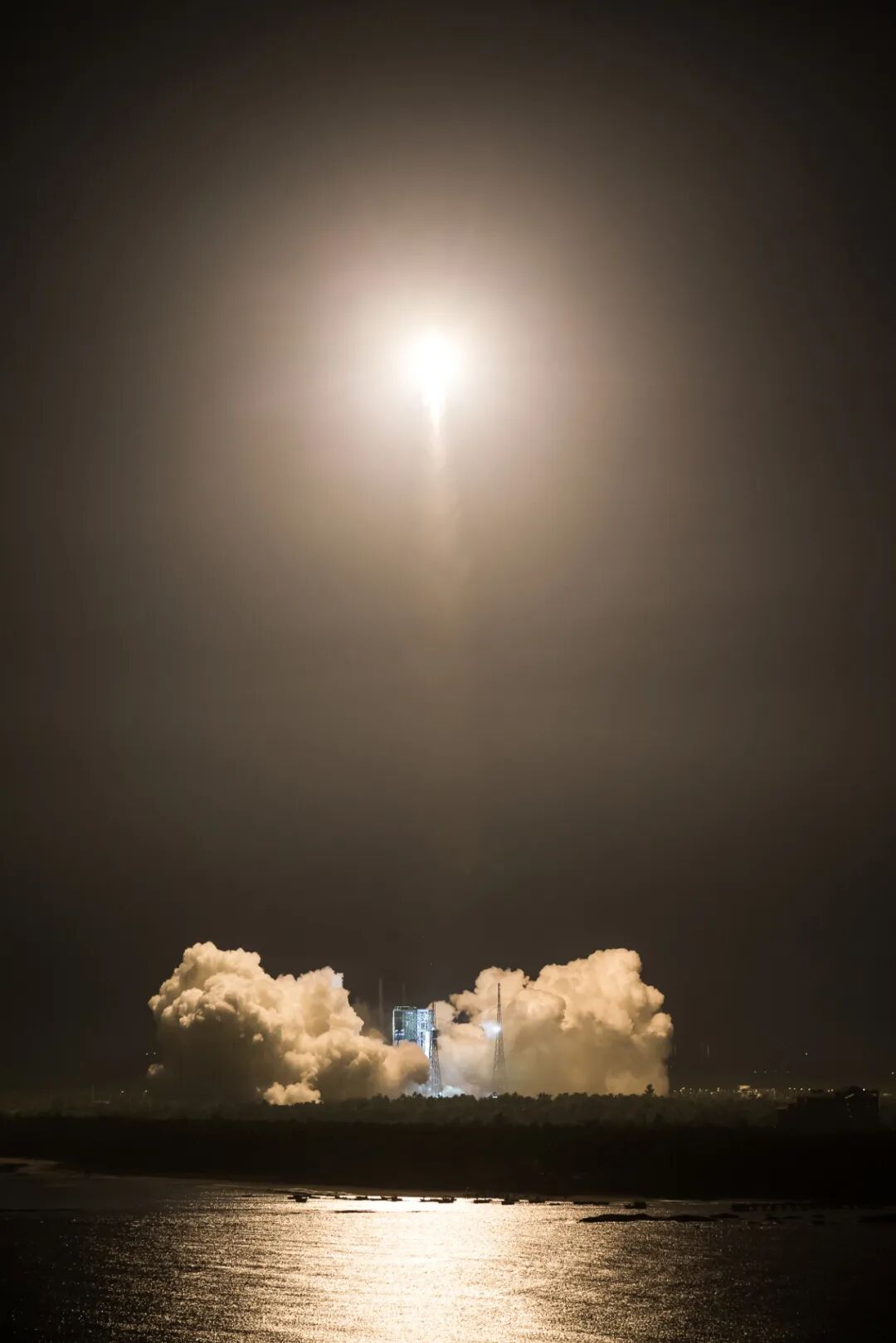 (长征七号升空,映照在天空海面的火光耀眼夺目,摄影师@陈肖)