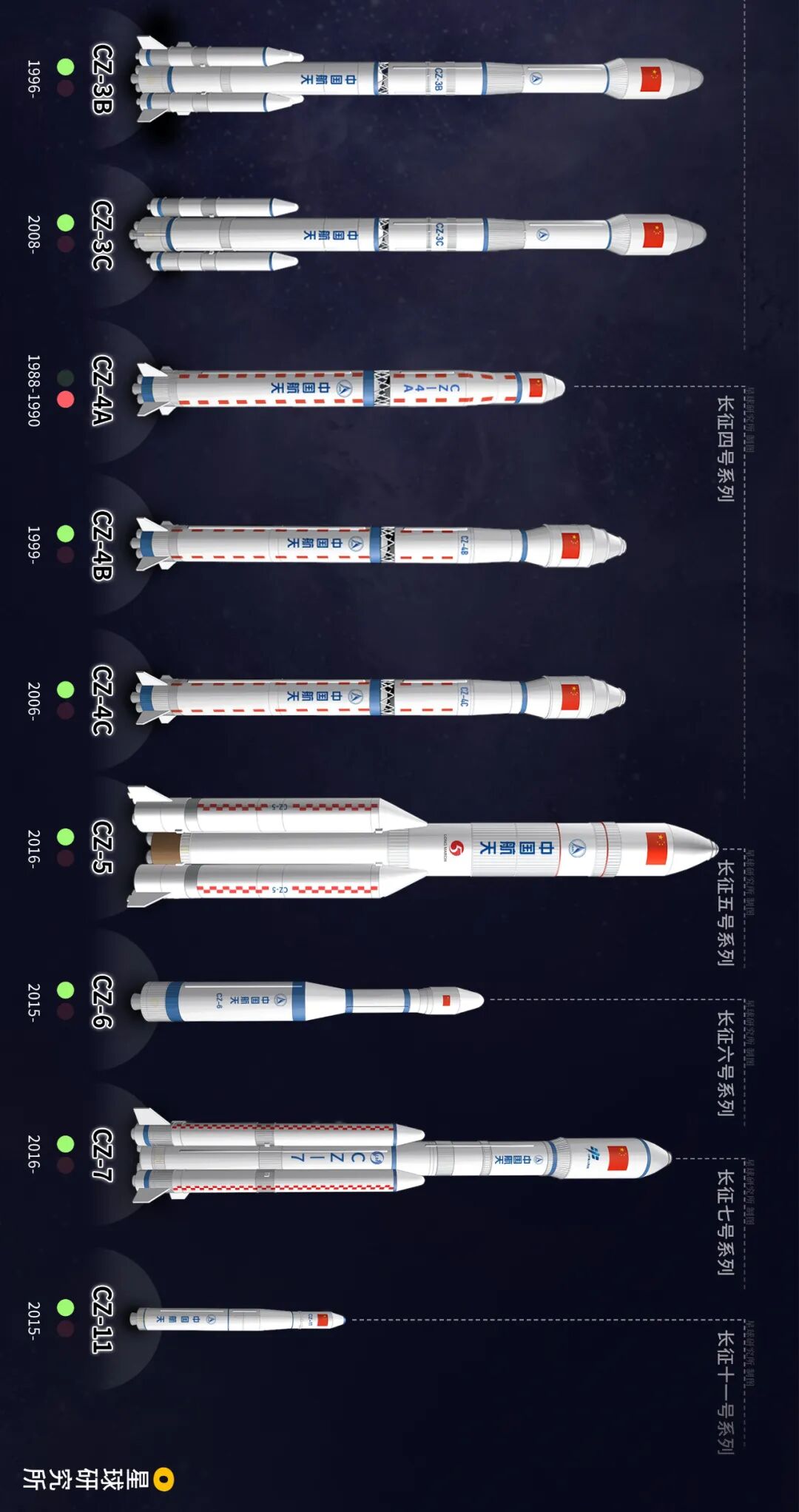 (请横屏观看,中国“长征”系列运载火箭主要型号型谱,制图@陈随/星球研究所)