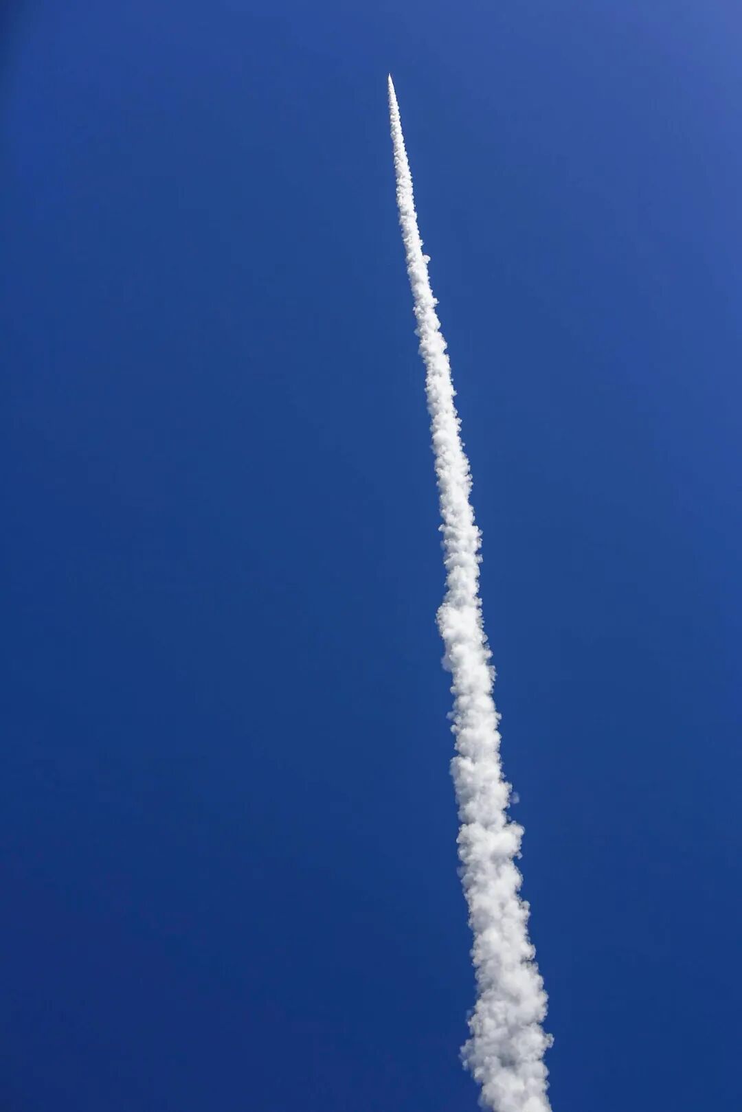 (第一级箭体分离场景,右侧白色轨迹为继续飞行的第二级箭体;此为中国民营火箭双曲线一号发射,供示意,摄影师@余明)