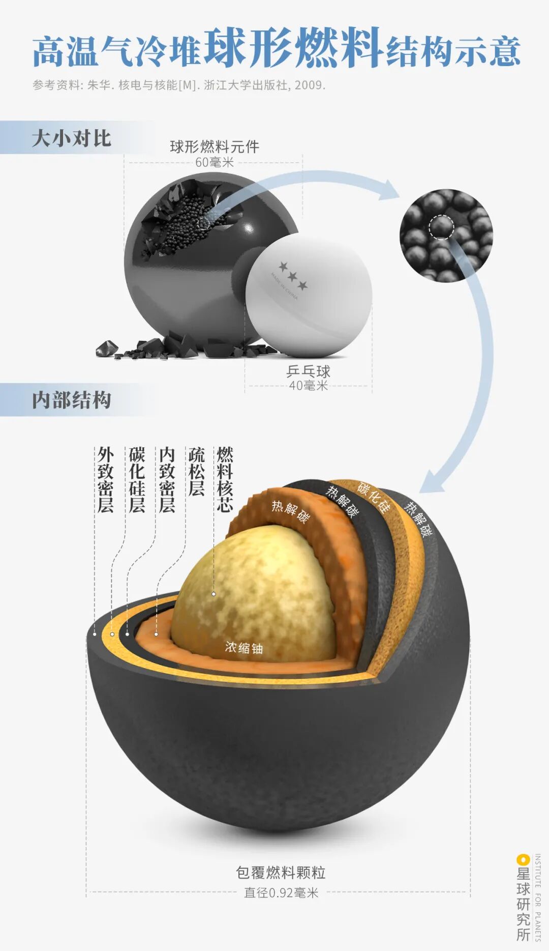 (高温气冷堆球形燃料结构示意,制图@郑伯容/星球研究所)
