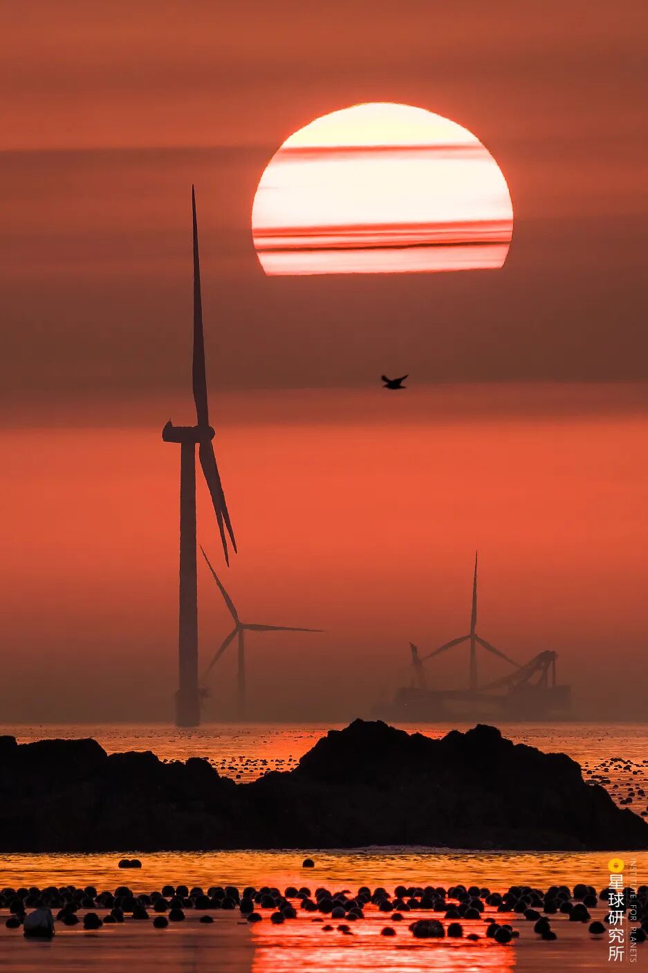 (日出下的海上风电场,拍摄于辽宁大连海王九岛,摄影师@NoOne晓东)
