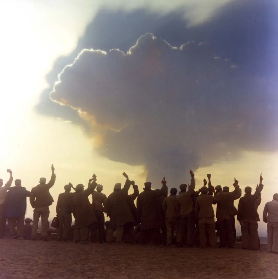 (1967年6月17日,我国第一颗氢弹在新疆罗布泊爆炸试验成功,工作人员纵情欢呼,摄影师@孟昭瑞/视觉中国)