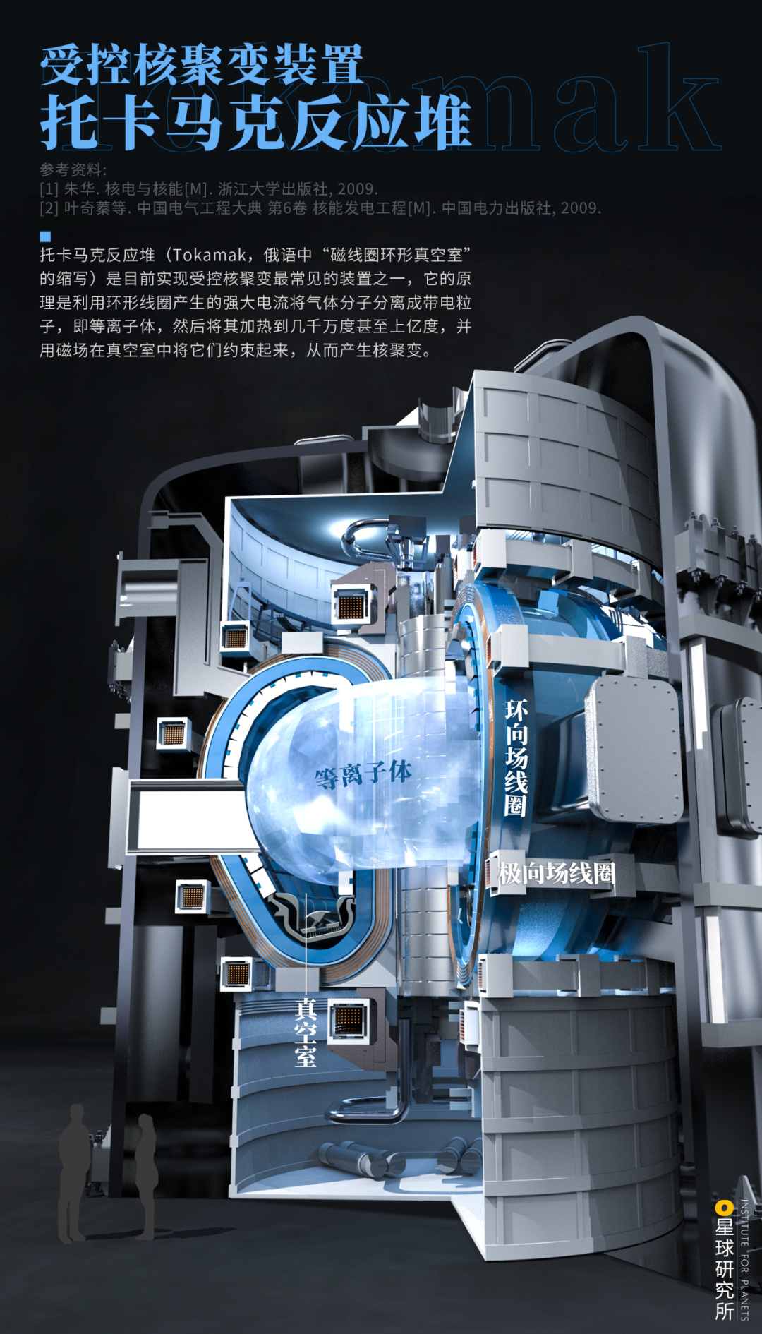 (受控核聚变装置,可以产生与太阳内部一样的核聚变反应,也被称为“人造太阳”,制图@罗梓涵/星球研究所)