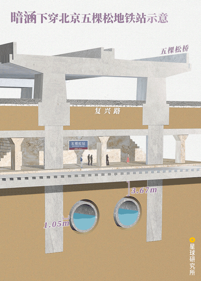 (北京五棵松地铁站纵向结构示意,制图@陈睿婷/星球研究所)