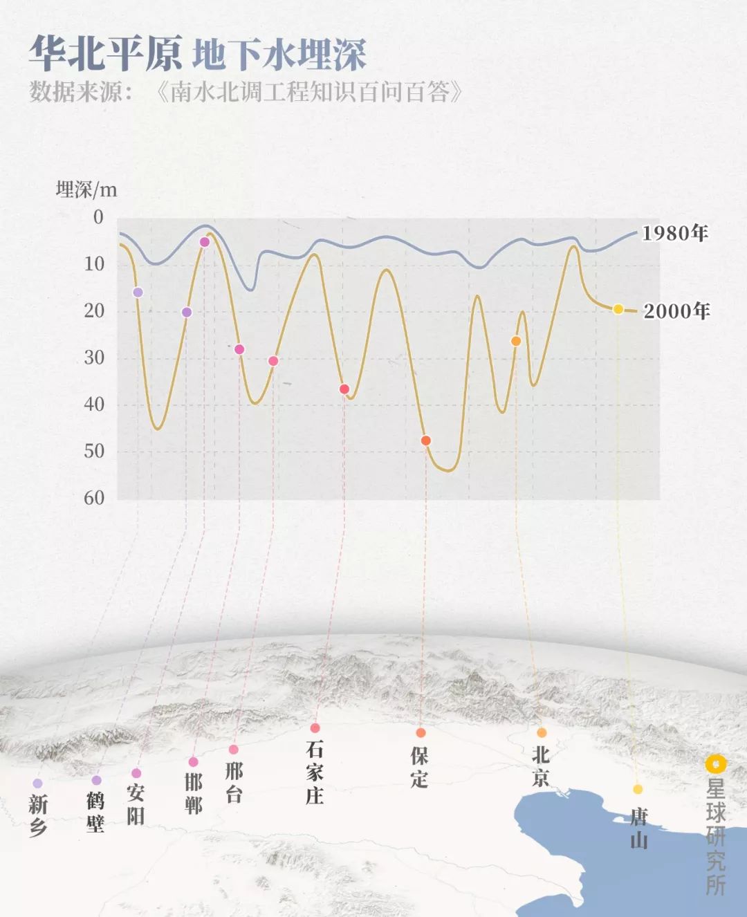 (地下水开采程度可用开采系数表示,即实际开采量与可开采资源量之比,若系数大于100%则为超采;下图为1980年和2000年华北地区浅层地下水埋深对比,制图@王朝阳&陈睿婷/星球研究所)