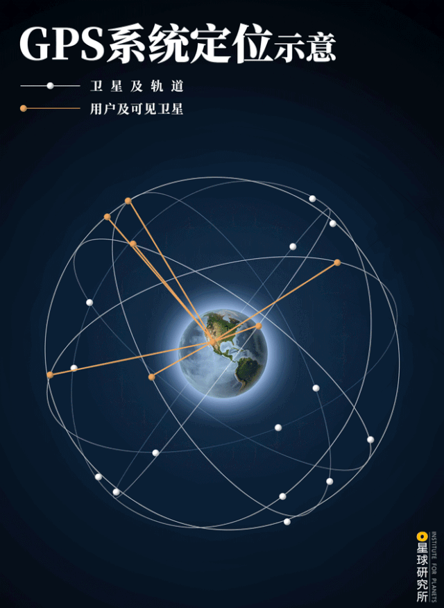 (GPS系统定位示意,同一点上空的卫星多在4颗以上,原图来源@维基百科,重制@郑伯容/星球研究所)