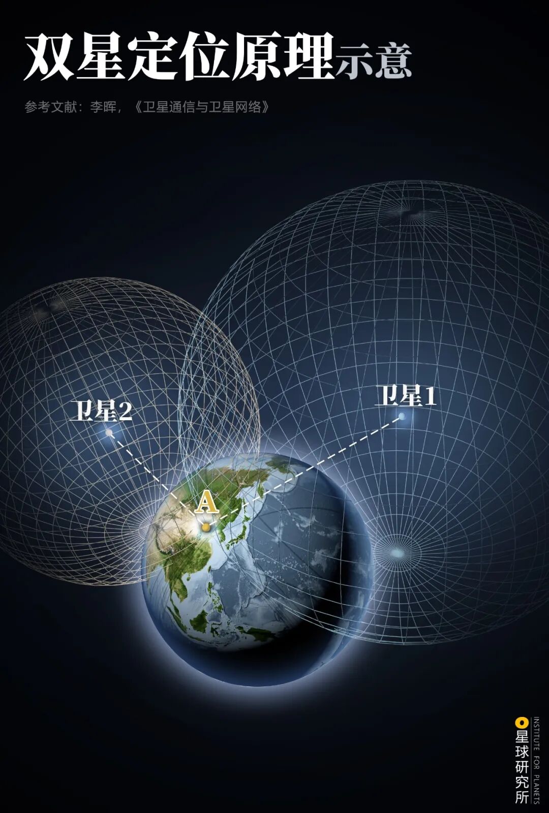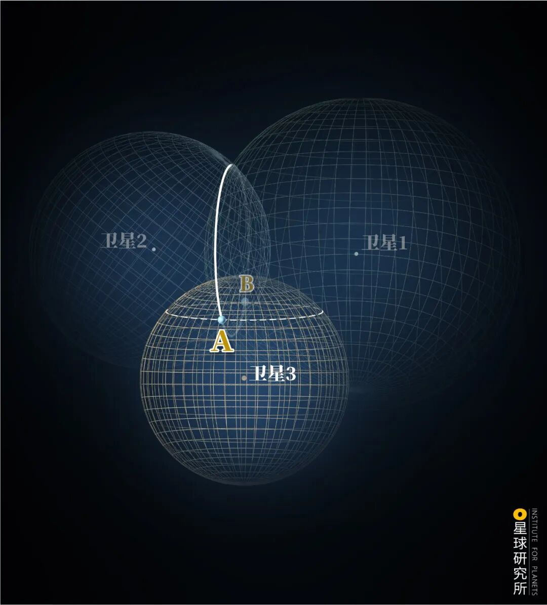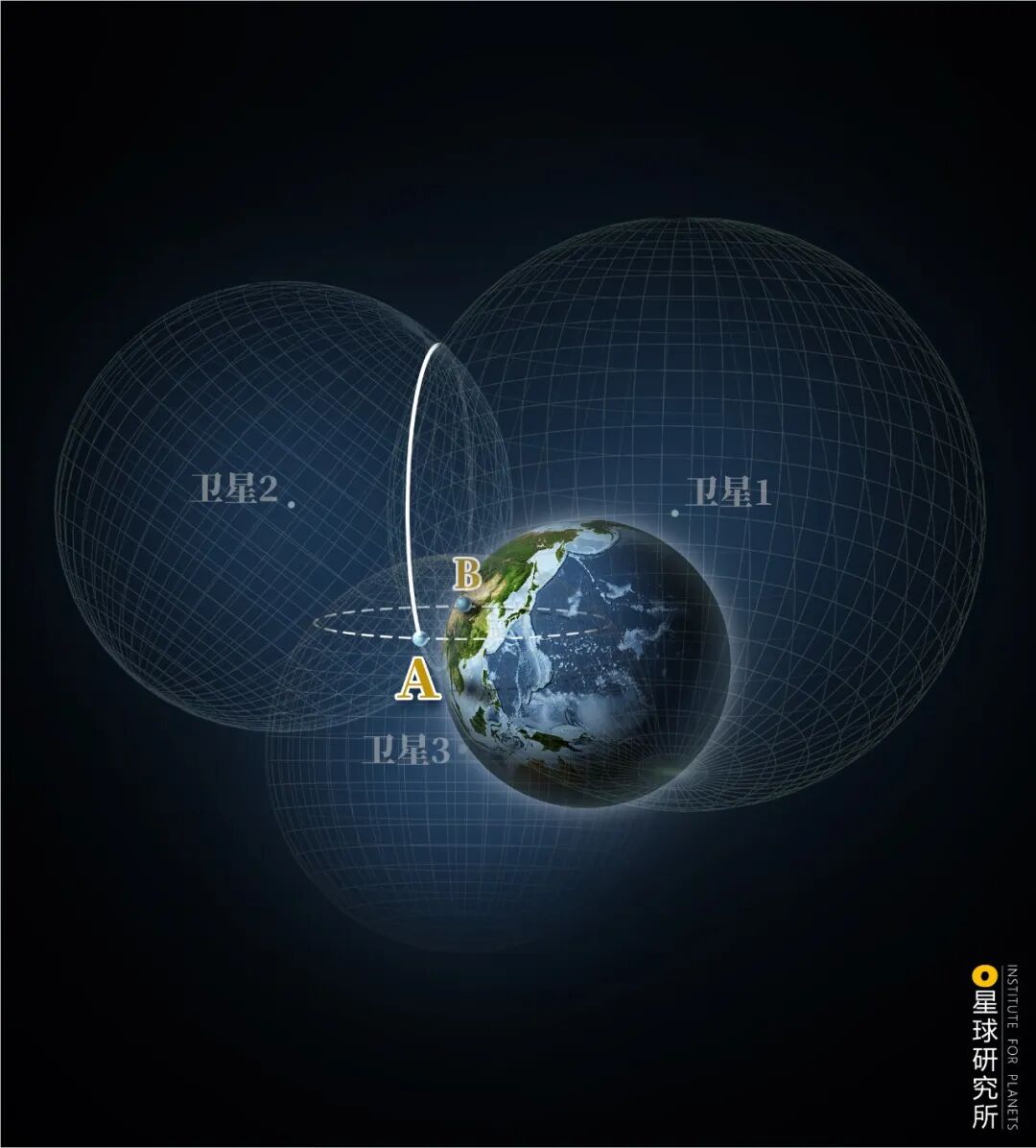 (三颗导航卫星确定的位置——两个点,制图@郑伯容/星球研究所)