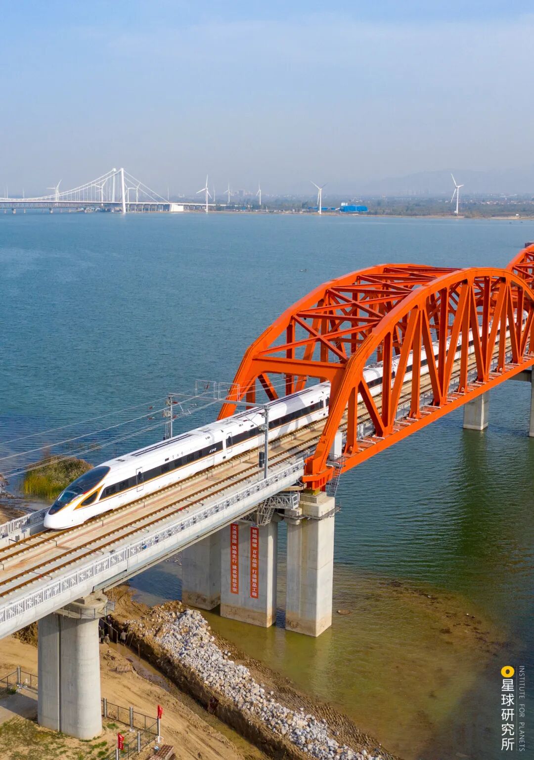 (以350公里时速行驶的京张高铁,可以实现从驾驶一次制动到停车的停准误差不到10厘米,下图为跨河而过的京张高铁,摄影师@赵斌)