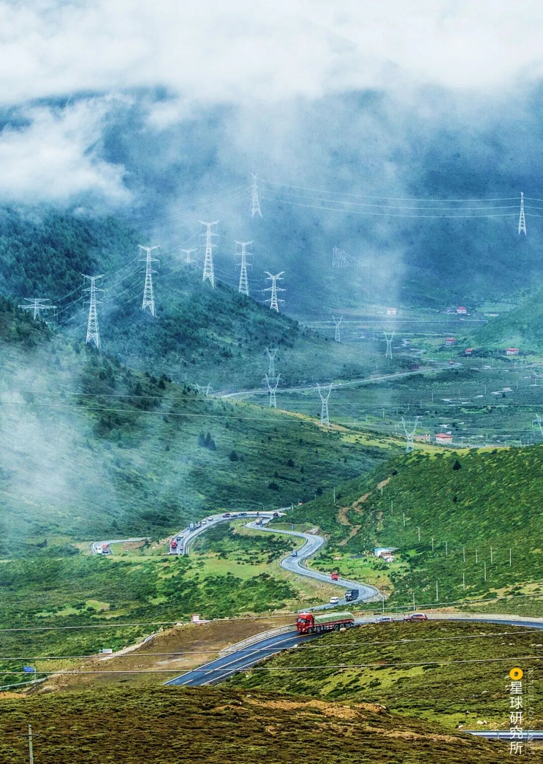 (在电力线路中安装北斗线路故障指示仪,准确发现事故地点,及时排除故障,减少停电时间。下图为山谷中此起彼伏的输电塔,摄影师@邱会宁)