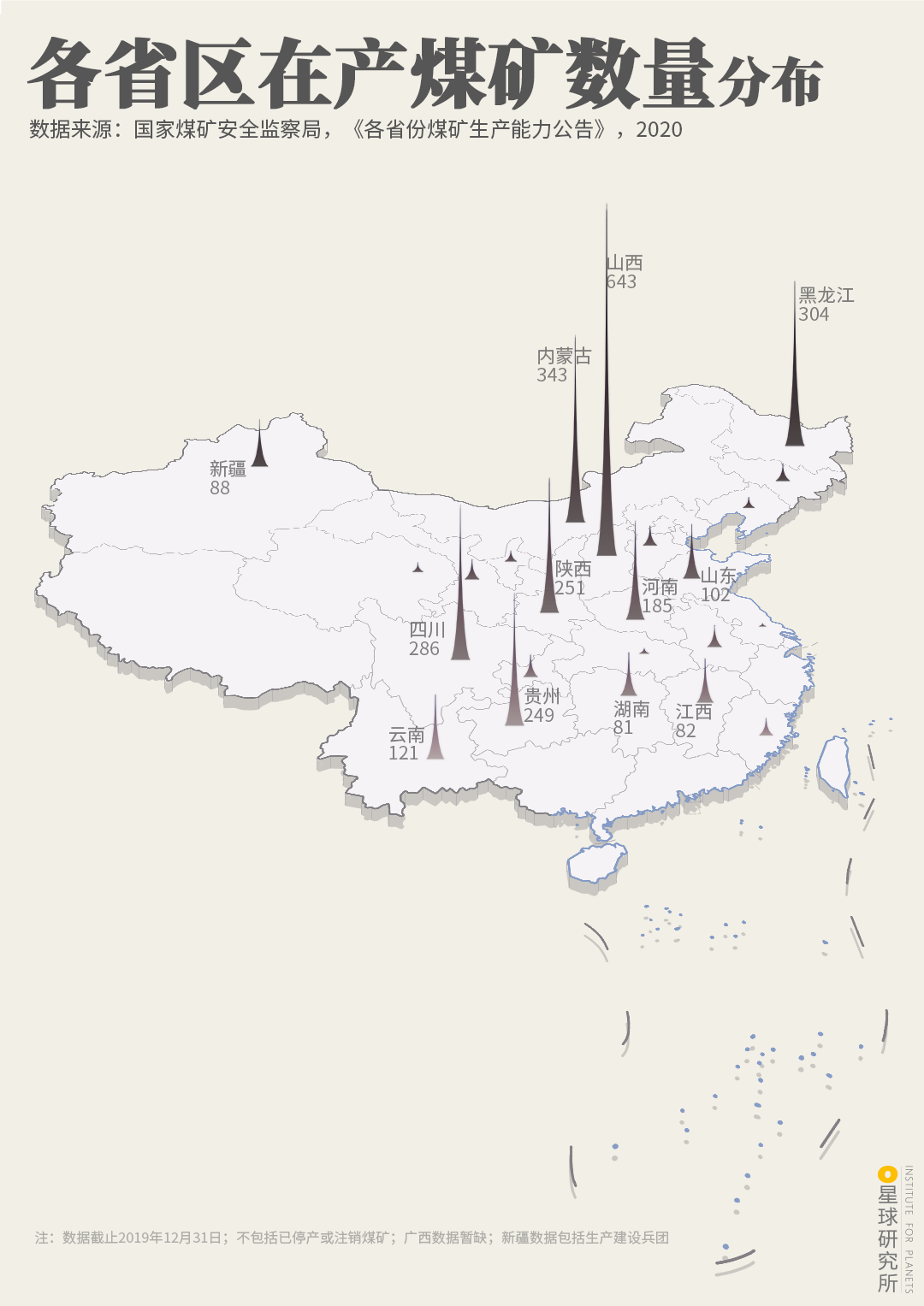 (各省区在产煤矿数量分布,制图@陈志浩/星球研究所)