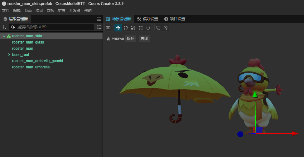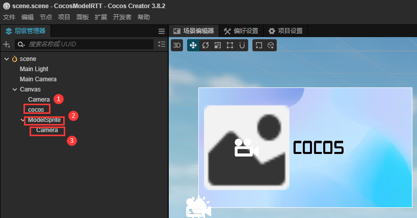 按照下面结构拼一下UI。cocos是背景图,ModelSprite是渲染到的目标精灵,Camera是拍模型的摄像机。