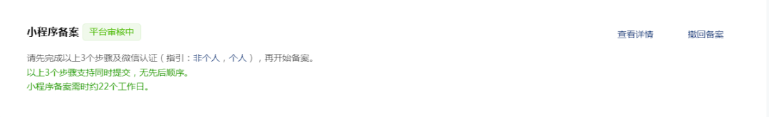 备案申请提交后,需要继续耐心等待,官方预估小程序备案需时约22个工作日。