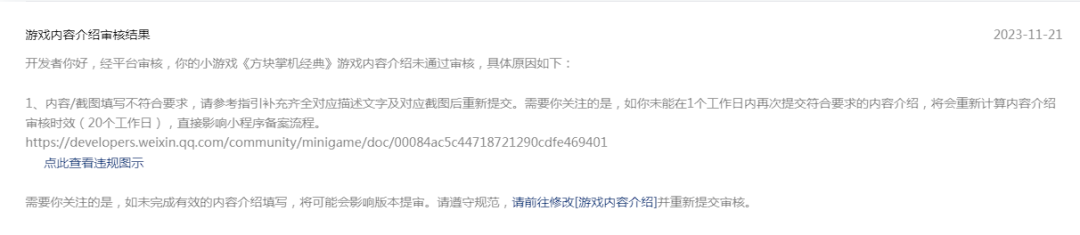 于是笔者根据《游戏内容介绍填写示例》(链接可在文末获取),赶在1个工作日内认真修改并重新提交内容介绍审核。