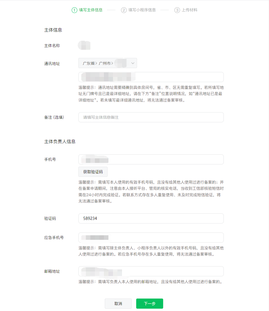 需要填写主体信息和主体负责人信息,内容比较简单。