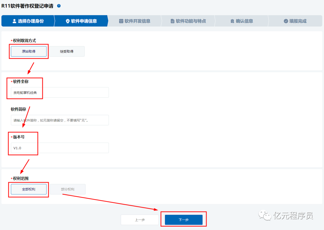 选择权利取得方式-原始获得,填写软件全称,版本号,以及权利范围-全部权利,下一步。