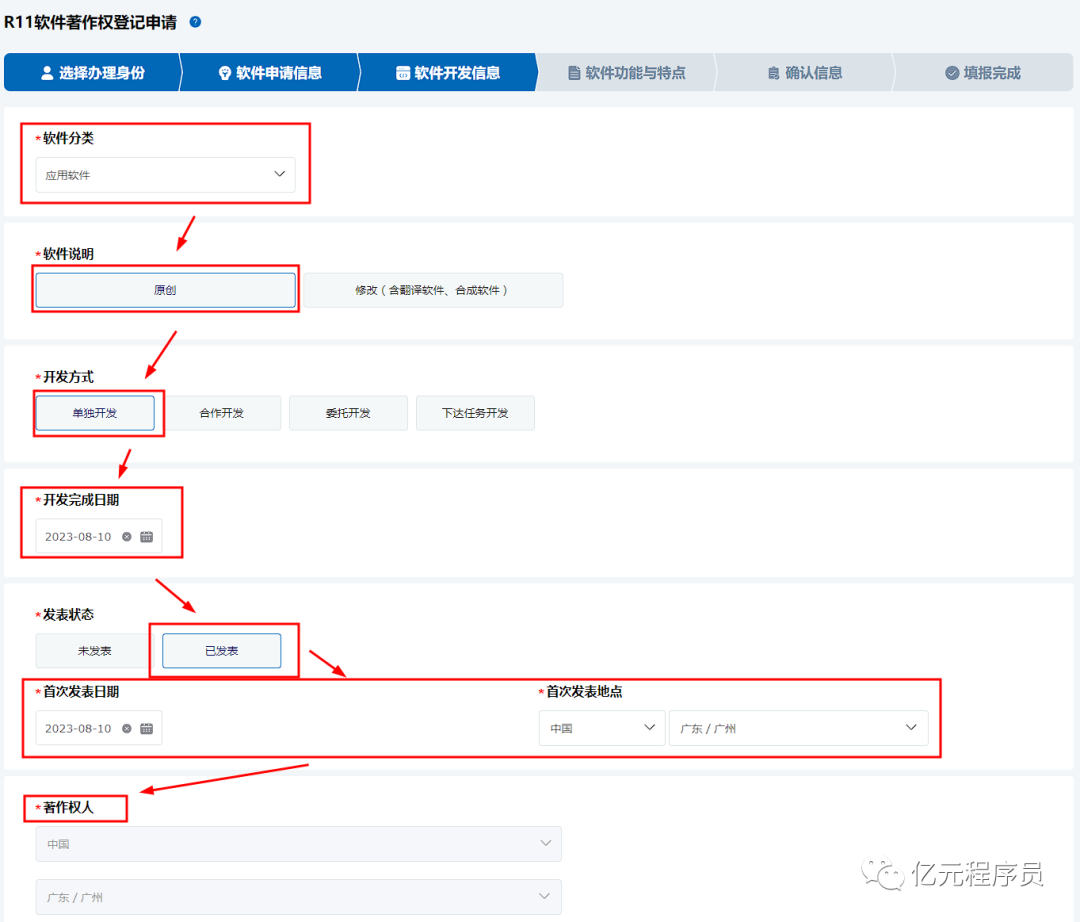 依次选择软件分类-应用软件,软件说明-原创,开发方式-单独开发,填写开发完成日期,发表状态-已发表,选择首次发表日期和地点,填写著作权人信息。下一步。