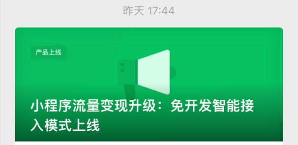 微信广告创新推出小程序广告免开发智能接入模式,同时下调小程序流量主开通门槛,助力更多中小开发者获取变现收益。