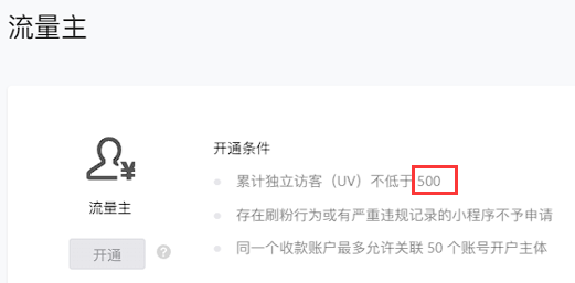 为助力更多开发者获取流量变现收益,小程序流量主的开通门槛已从“累计独立用户(UV)≥1000”下调至“累计独立用户(UV)≥500”。