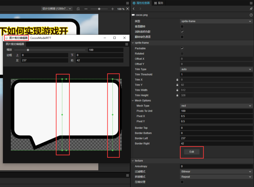然后通过属性面板Edit按钮打开图片裁剪编辑器,处理下编辑下九宫格信息。