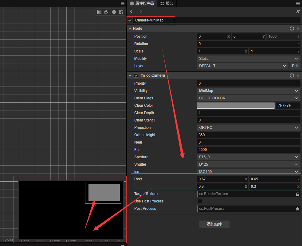 其中注意调整一下摄像机的Rect属性,调整位置与大小至右上角。