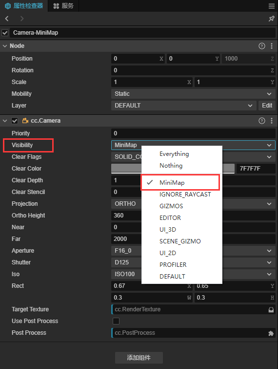 设置小地图摄像机的Visibility属性只勾选我们自定义的MiniMap层级。