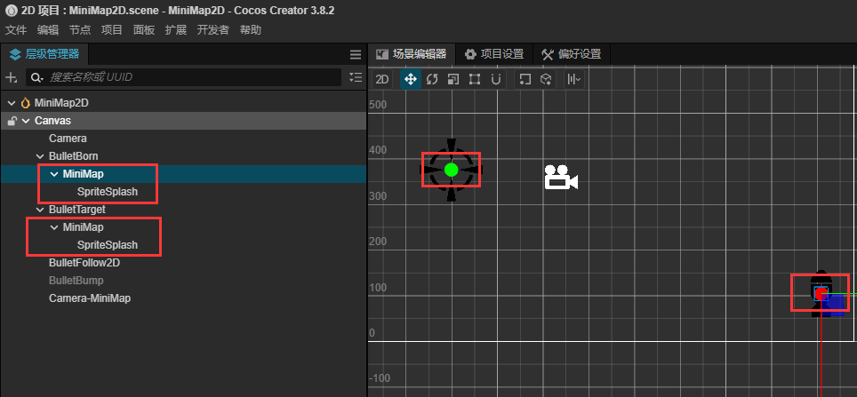 最后给我们的目标和子弹添加一个简单的标记在小地图中显示。