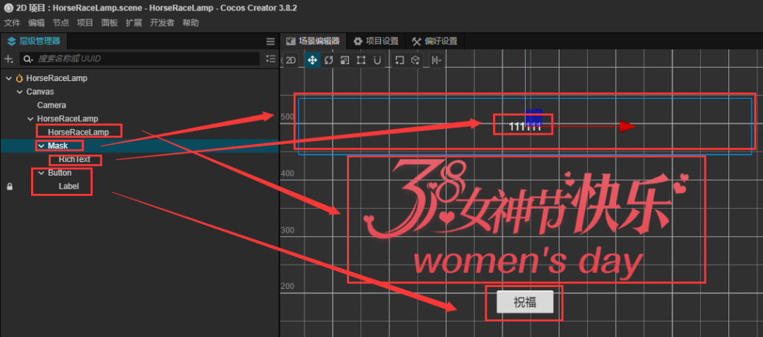 如图所示,把小姐姐给的图片拖到场景中去,然后添加一个按钮用于测试触发跑马灯,再添加一个Mask组件和RichText组件。
