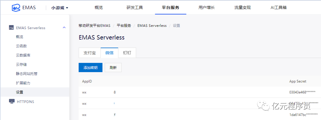登陆EMAS Serverlesss后台设置-微信-添加秘钥,输入小游戏的AppID和App Secret。