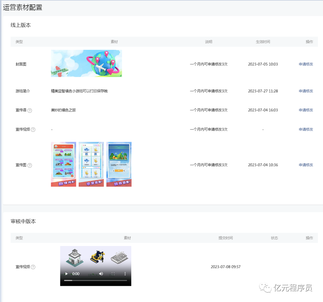 小游戏封面图、游戏简介、宣传语、宣传视频、宣传图。在MP后台-游戏运营工具箱-基础运营素材-运营素材配置: