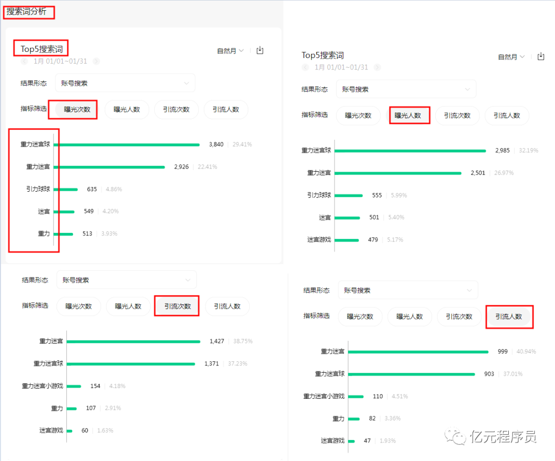 3.搜索词分析中-Top5搜索词可以清楚看到游戏被搜索展示最多的前五个关键词,曝光次数、曝光人数、引流次数和引流人数。
