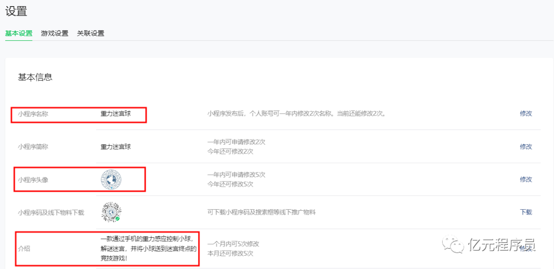 小游戏名称、头像和介绍。在MP后台-设置-基本设置-基本信息: