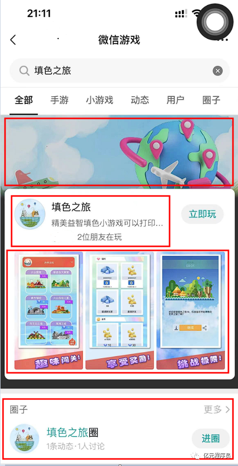 情况二:通过微信游戏页面搜索到小游戏展现的信息包括小游戏的封面图、名字、图标、介绍、3张宣传图、游戏圈: