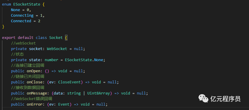 包括Socket连接状态枚举(未连接,连接中,已连接),核心模块WebSocket模块,以及一些回调:
