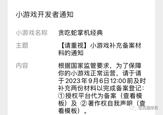 前阵子工信部发布了《工业和信息化部关于开展移动互联网应用程序备案工作的通知》,为此,微信公众平台ICP代备案管理系统提供新增备案、变更备案、注销备案等服务,协助开发者更好更方便地完成微信小程序备案,届时所有9月1号后准备初次上线的小游戏都需要通过备案之后才可以上线。但是笔者9月1号前上限的小游戏也收到了补充备案材料的通知。