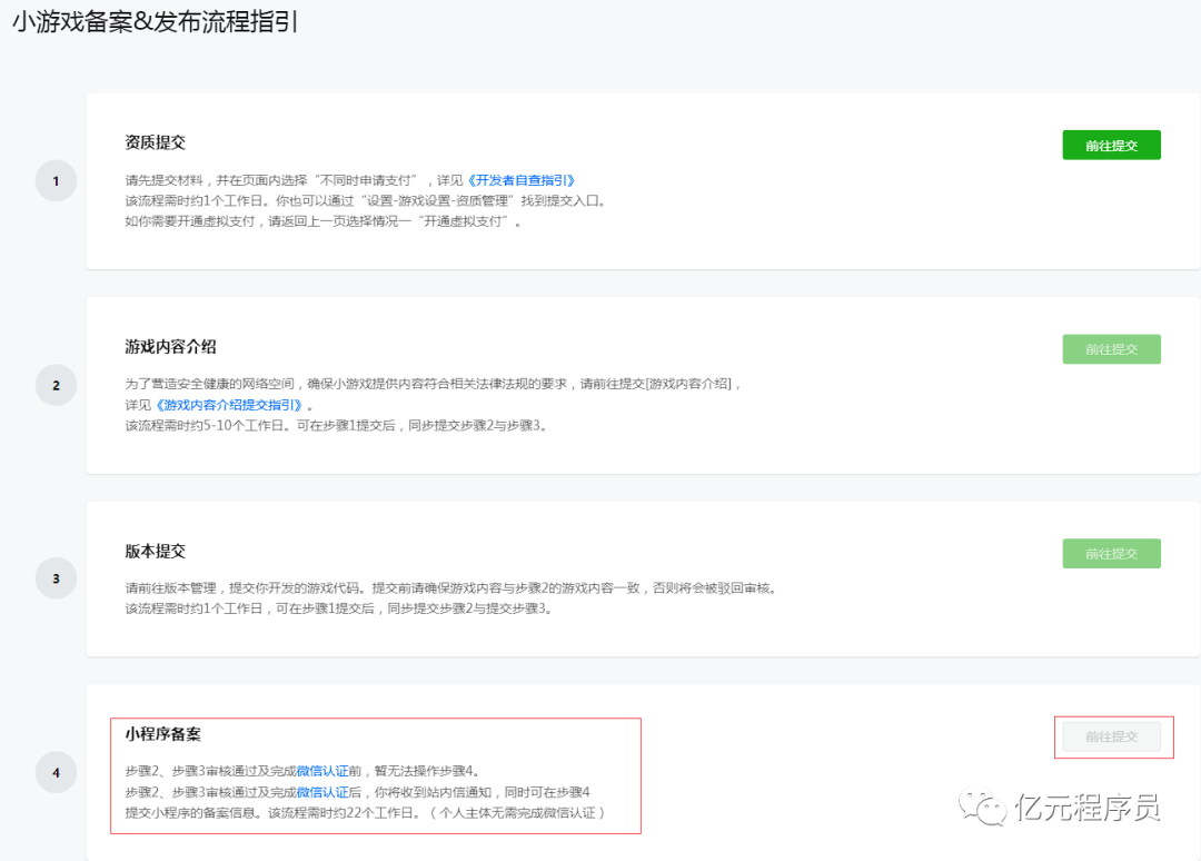 目前可以看到小程序需要先完成资质提交、游戏内容介绍和版本提交审核通过后才可以进行小程序备案,在审核通过后将收到站内信通知: