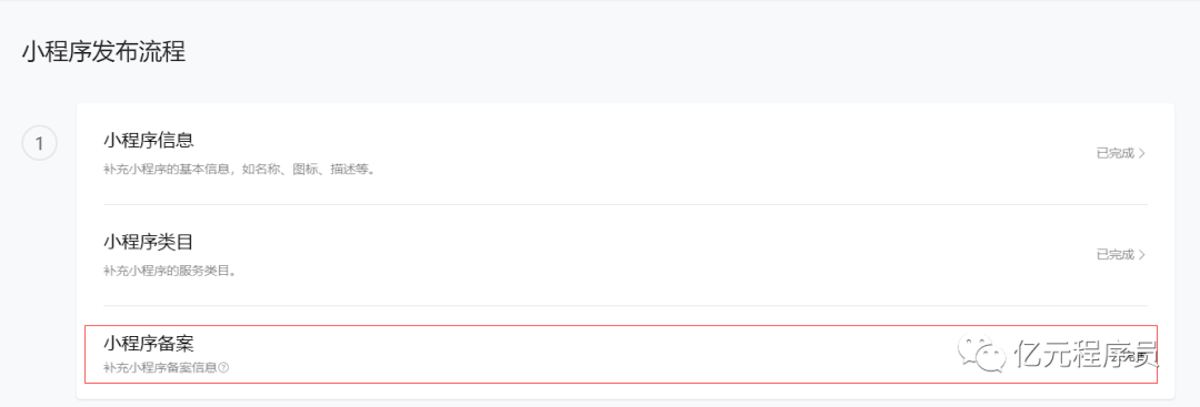 在小程序后台首页-小程序发布流程-小程序备案-点击去完善: