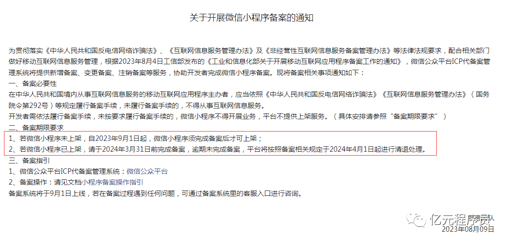 根据前面小程序备案的通知可以看到,9月1号前已上架的小程序可以在2024年3月31日前完成备案: