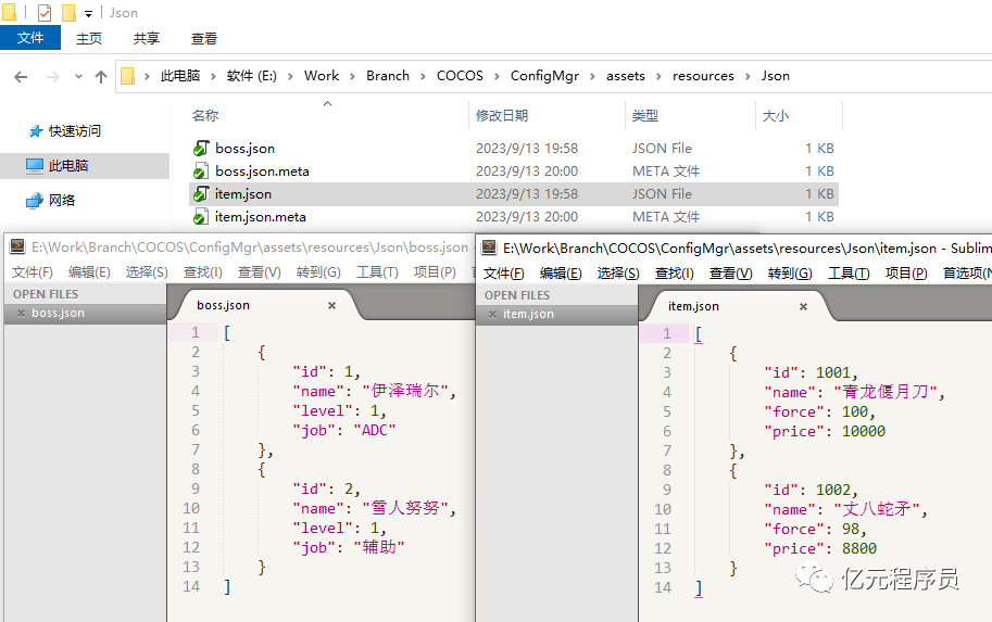 在assets\resources\Json目录下添加boss.json和item.json两个配置分别是boss的配置和道具的配置。