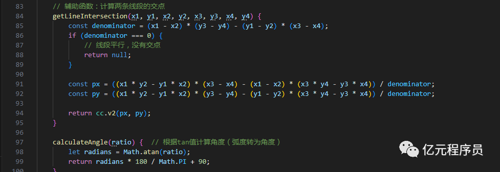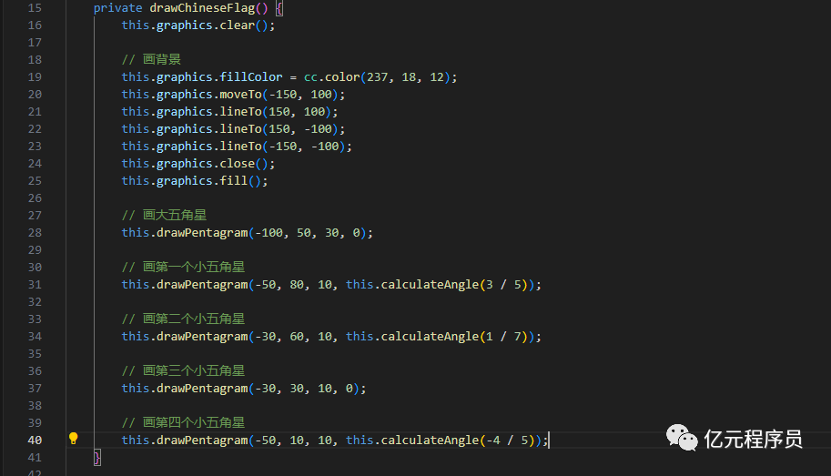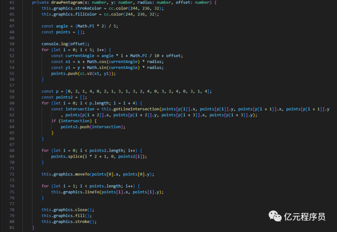 画五角星的核心代码,通过标准的方法确定五角星的五个顶点的位置,并且通过他们的连线确定他们的交点。然后依次连接所有的点形成五角星。