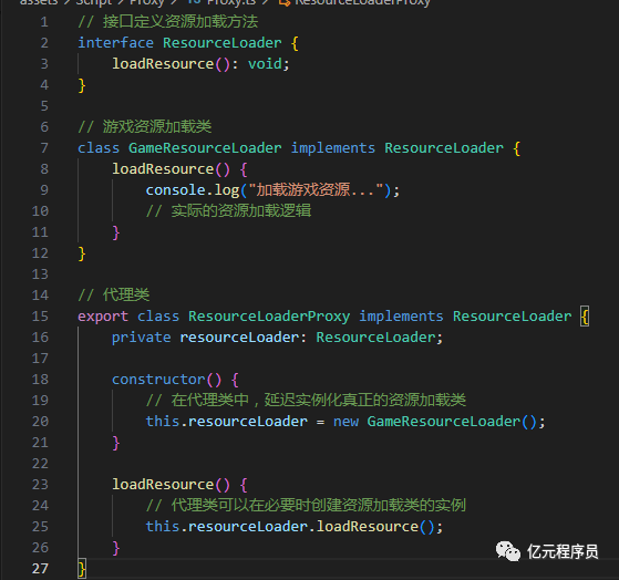 在上述代码中,ResourceLoaderProxy 是代理类,它控制对资源加载的访问,并延迟实例化真正的资源加载类 GameResourceLoader。