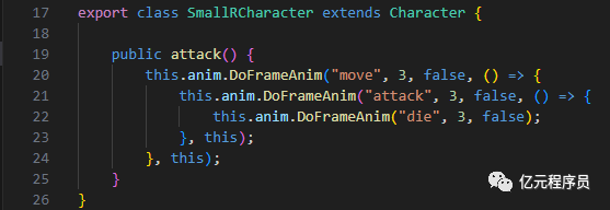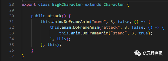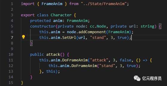 首先我们定义一个基础的角色类Charater,初始化时添加动画组件FrameAnim,该组件源码和教程可通过发送"FrameAnim"获取,包含一个攻击方法attack,攻击完后待机。