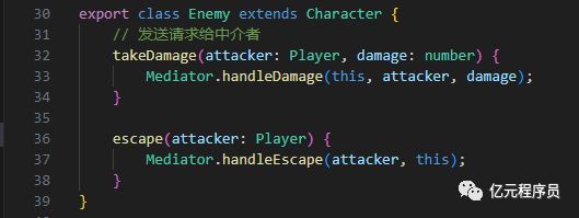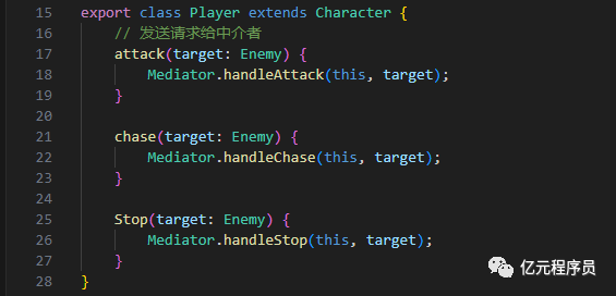 声明一个Mediator中介类。主要用来处理玩家的请求和将请求传达给目标。