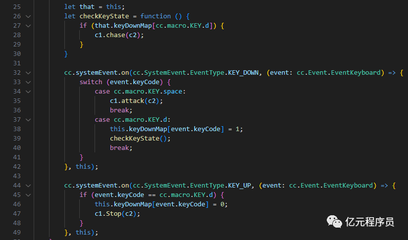 监听事件,键盘space键控制玩家攻击,长按键盘d移动角色,放开d取消移动。