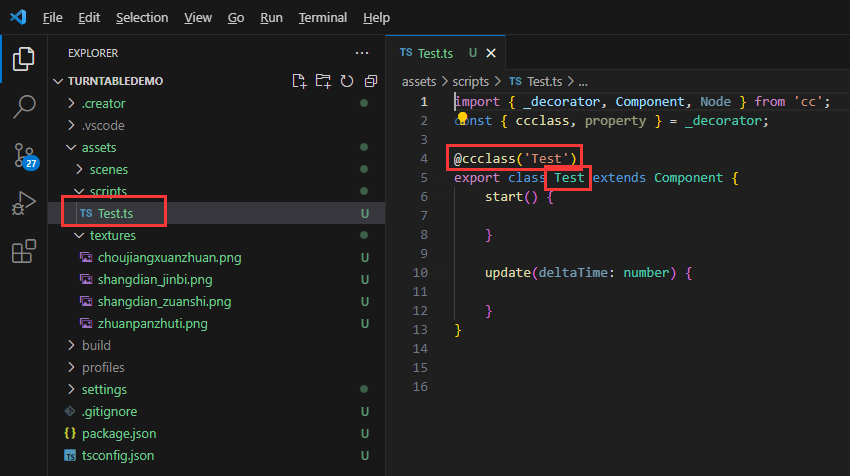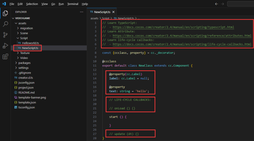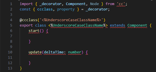 第二种则是在Cocos3.X的项目开发中,官方也算是考虑到强迫症的我们,新创建的脚本非常整洁,只有start和update方法,而且还非常贴心地帮我们把组件的名字修改成与创建时一致。